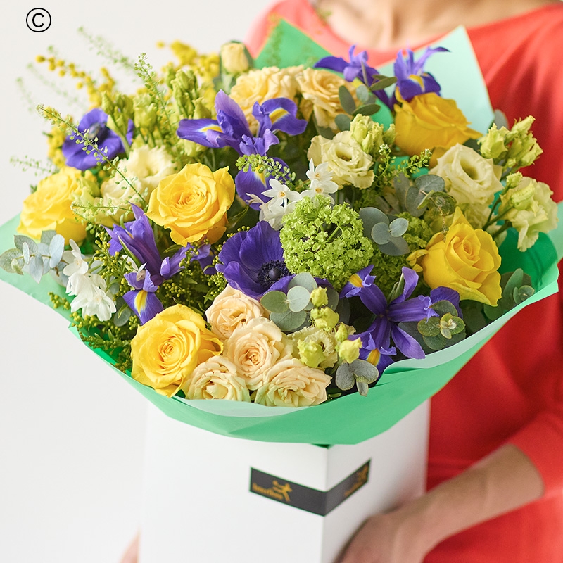 A gorgeous bouquet of fresh blooms including at least five yellow roses and four purple iris, expertly arranged into a stunning bouquet.